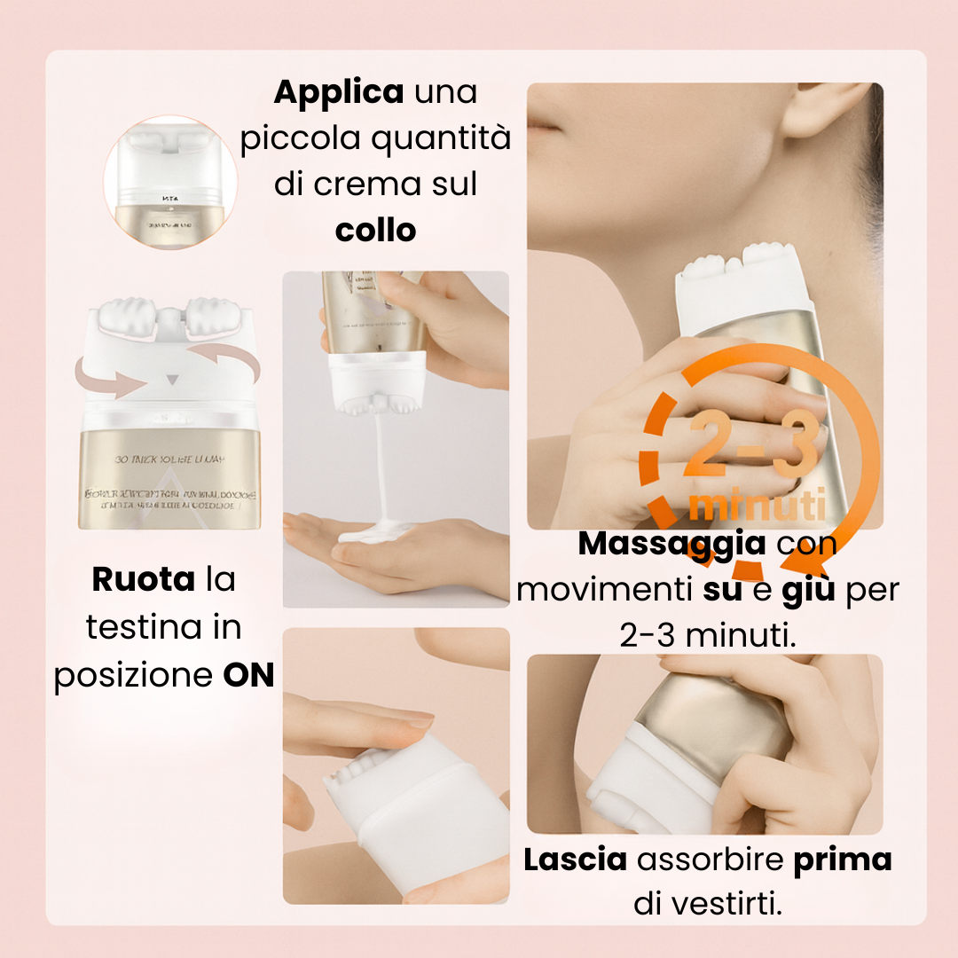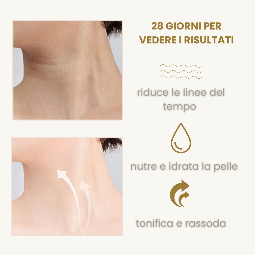 Dopo, grazie all’azione sinergica dell’Hexapeptide-8 e al massaggio stimolante del rullo integrato, la pelle ritrova compattezza, luminosità e armonia. Giorno dopo giorno, il contorno del collo si ridefinisce, la texture si leviga, le rughe si attenuano.