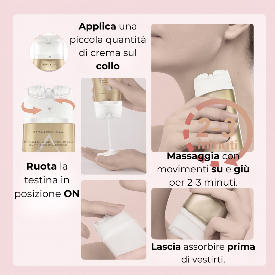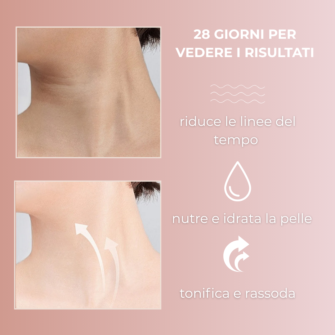 Dopo, grazie all’azione sinergica dell’Hexapeptide-8 e al massaggio stimolante del rullo integrato, la pelle ritrova compattezza, luminosità e armonia. Giorno dopo giorno, il contorno del collo si ridefinisce, la texture si leviga, le rughe si attenuano.